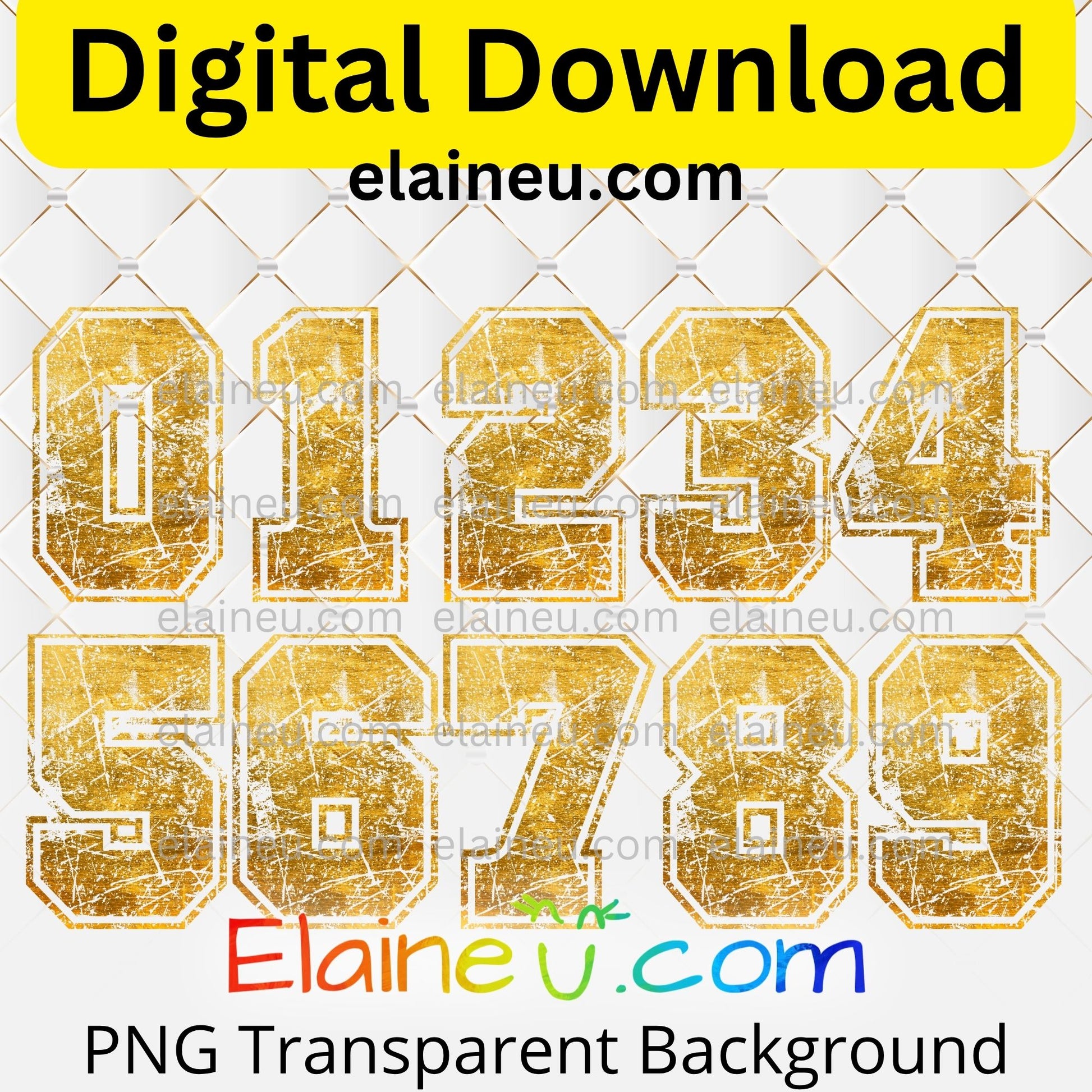 gold grunge numbers, varsity sports clipart, distressed athletic numbers, gold number PNG, grunge sports number design, vintage varsity font, metallic gold printable, team number clipart, digital athletic numbers, sports project download