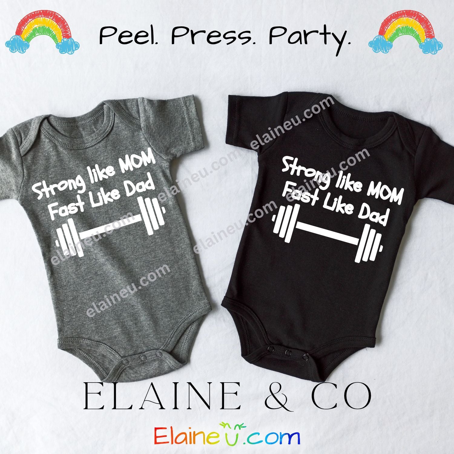 Create a custom baby onesie or outfit with this fun iron-on decal featuring the phrase "Strong Like Mom, Fast Like Dad." Perfect for DIY baby shower gifts, photo shoots, or everyday wear, this heat transfer vinyl design makes it easy to personalize clothing at home.